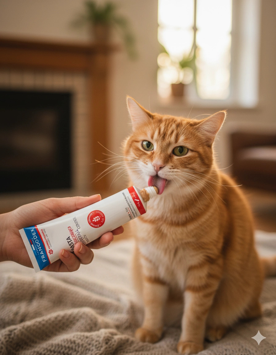 - Łatwość stosowania – Wystarczy nałożyć pastę na przednie łapy kota, aby mógł ją zlizywać, lub wymieszać z jedzeniem dla jeszcze większej wygody.