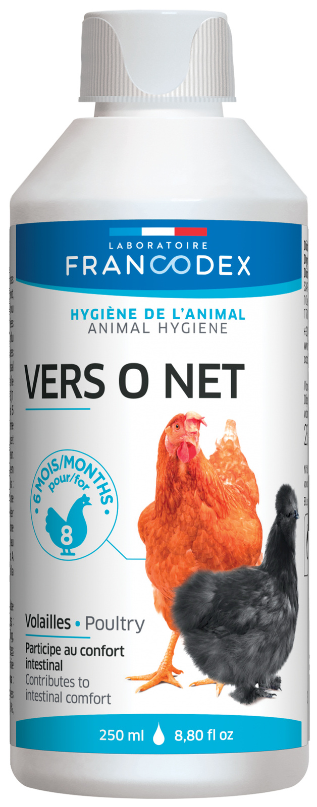 Ptaki posiadają bardzo wrażliwy układ trawienny. Wiele czynników, takich jak stres, zmiany temperatury czy pasożyty mogą negatywnie wpływać na jego funkcjonowanie. VERS O NET Laboratoire Francodex to suplement diety zawierający składniki mineralne, pierwiastki śladowe i ekstrakty z aromatycznych roślin (czosnek, tymianek i wrotycz) pomagający organizmowi bronić się przed niekorzystnym działaniem tych czynników. SPOSÓB UŻYCIA: Produkt należy rozcieńczyć w wodzie do picia: 2-3 ml (około 1 łyżeczka) na litr wody pitnej przez 5 dni. Powtarzać cyklicznie co miesiąc. Po raz pierwszy podać ptakom po ukończeniu 10. dnia życia, oraz obowiązkowo przed ich pierwszym wyjściem na zewnątrz. Szczególne zalecenia: Zapewnić prawidłowość procesu zmiany pożywienia i zrównoważoną dietę. Dbać o dobrą kondycję fizyczną drobiu, a także o higienę otoczenia. Warunki przechowywania: Chronić przed dziećmi, przechowywać w temperaturze pokojowej i w zacienionym miejscu. Dokładnie zamknąć butelkę po użyciu.
