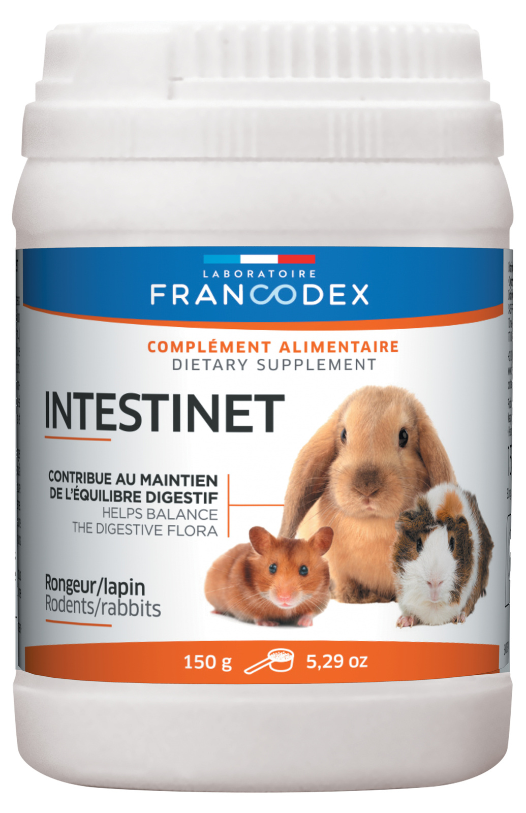 Produkt przeznaczony dla wszystkich małych gryzoni (chomików, królików miniaturowych, świnek morskich, fretek).INTESTINET reguluje florę przewodu pokarmowego i jelit. Pomaga w odzyskaniu prawidłowej wagi gryzoniom o niedostatecznej masie ciała. Sposób użycia: wymieszać proszek w wodzie pitnej, aż do całkowitego rozpuszczenia. Podawać regularnie przez 2 kolejne dni w tygodniu w ilości 3 dawek na 3 łyżki wody pitnej (45 ml).W przypadku zaburzeń trawienia: podawać INTESTINET codziennie w ilości 3 dawek na 3 łyżki wody pitnej (45 ml) przez 10 dni lub przez cały czas leczenia. Należy codziennie zmieniać zwierzętom wodę do picia. Fermenty mlekowe, kazeiniany wapnia