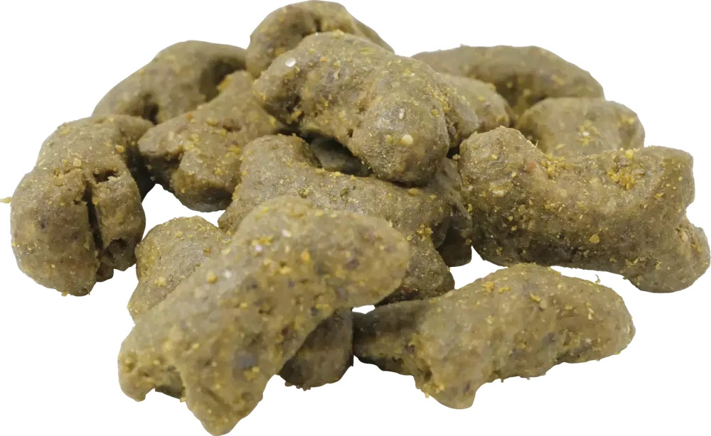 drożdże piwne, tłuszcz z kaczki, białko z dyni, kurkuma, korzeń prawoślazu, pulpa buraczana, spirulina. Dodatki (/kg): przeciwutleniacz: ib306(i) tokoferol pochodzący z olejów roślinnych 452 mg/kg. Składniki analityczne: białko surowe 25%, tłuszcz surowy 13%, włókno surowe 4%, popiół surowy 3,5%, witamina D3 5 μg, wartość energetyczna (energia metaboliczna) 366 kcal/100 g.