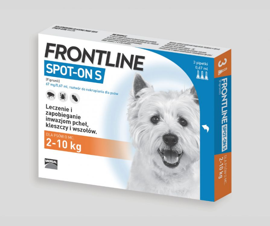 ipronil 10g/100ml, roztwór do nakrapiania. Preparat w konfekcjach: Frontline Spot On Koty (pipeta 0,5 ml), Frontline Spot On Psy S (pipeta 0,67 ml), Frontline Spot On Psy M (pipeta 1,34 ml), Frontline Spot On Psy L (pipeta 2,68 ml), Frontline Spot On Psy XL (pipeta 4,02 ml).