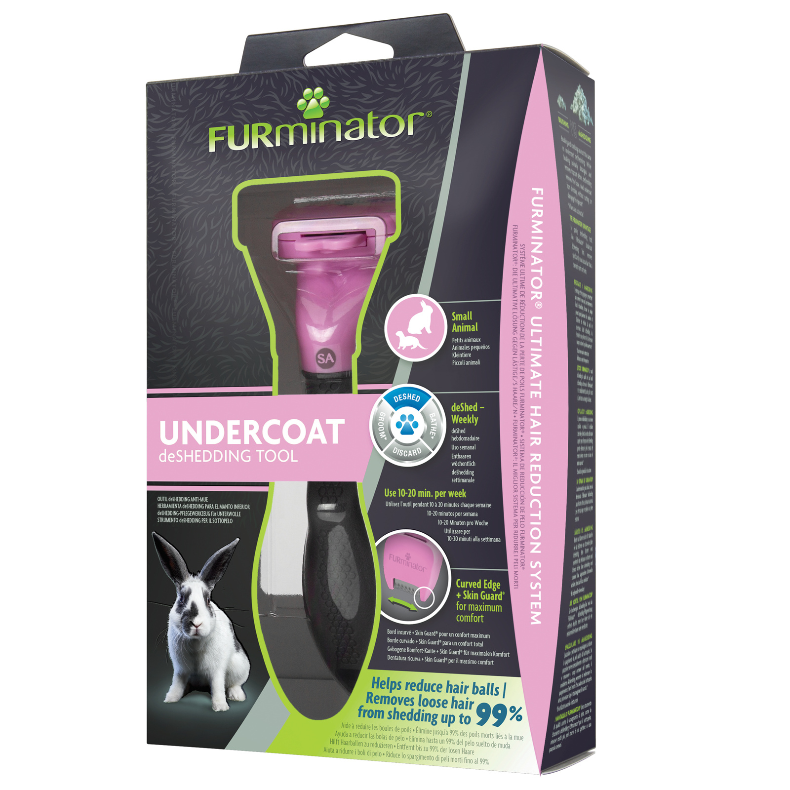 Narzędzie FURminator® do usuwania podszerstka dla małych zwierząt domowych, do wszystkich typów sierści. Narzędzie zaprojektowane specjalnie dla małych zwierząt takich jak króliki czy świnki gwinejskie, aby ochronić je przed powstawaniem niebezpiecznych kul włosowych i związanych z nimi schorzeń układu pokarmowego. Produkt został zaprojektowany w celu promowania zdrowej skóry i sierści u zwierząt domowych oraz znacznego zmniejszenia ilości włosów, które każdego dnia zwierzę gubi i roznosi po domu. Pozwala skutecznie usuwać podszerstek i martwy włos, redukując linienie do 99%. Osłonięte krawędzie zapobiegają podrażnianiu skóry i chronią urządzenie podczas jego przechowywania dzięki technologii Edge Guard. Łatwy w obsłudze. Intuicyjne czyszczenie.
