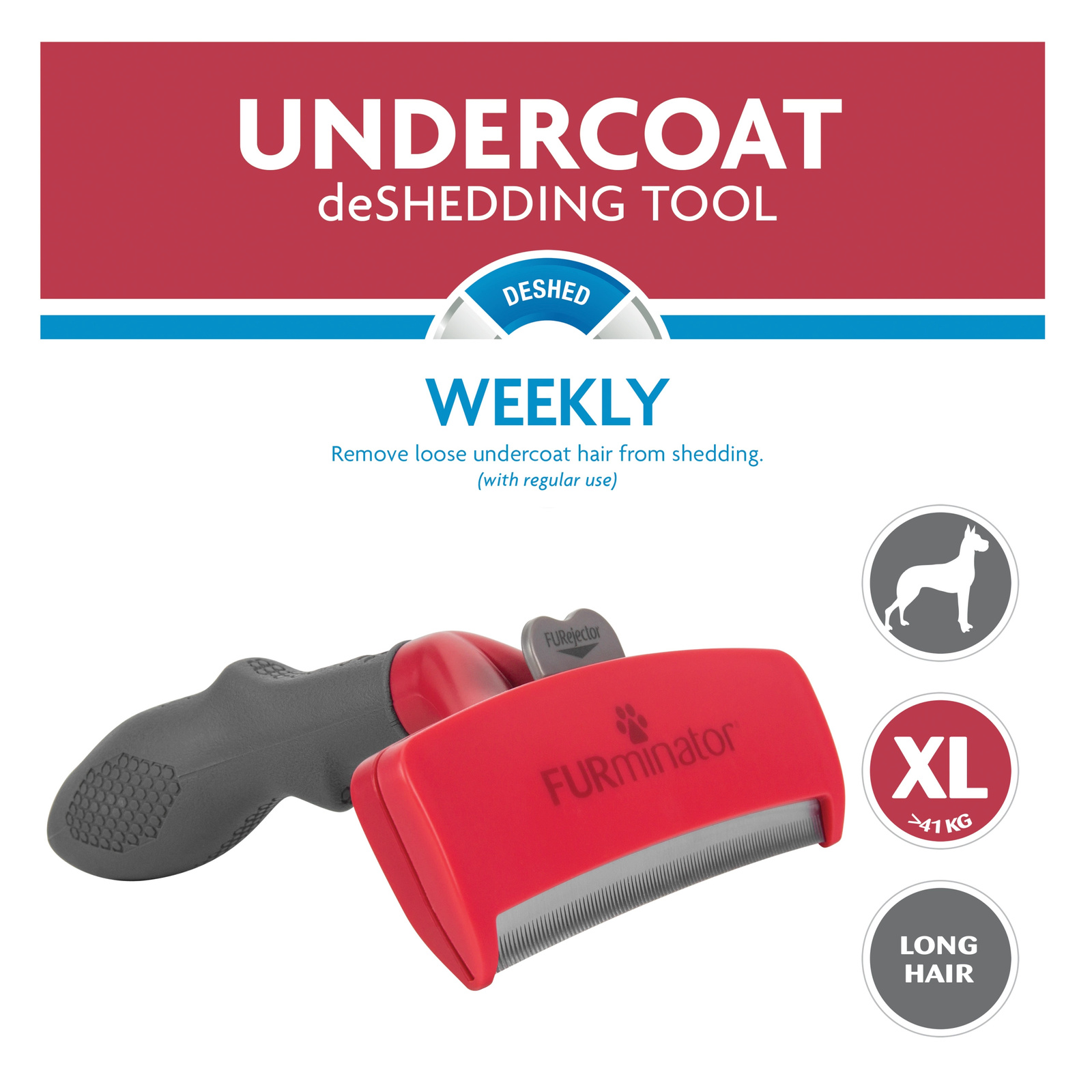 Narzędzie FURminator® do usuwania podszerstka dla długowłosych psów olbrzymich ras (XL). Narzędzie zaprojektowane specjalnie dla psów o masie ciała powyżej 41 kg o sierści dłuższej niż 5 cm. Produkt został zaprojektowany w celu promowania zdrowej skóry i sierści u zwierząt domowych oraz znacznego zmniejszenia ilości włosów, które każdego dnia zwierzę gubi i roznosi po domu. Pozwala skutecznie usuwać podszerstek i martwy włos, redukując linienie do 99%. Osłonięte krawędzie zapobiegają podrażnianiu skóry i chronią urządzenie podczas jego przechowywania dzięki technologii Edge Guard. Łatwy w obsłudze. Intuicyjne czyszczenie.