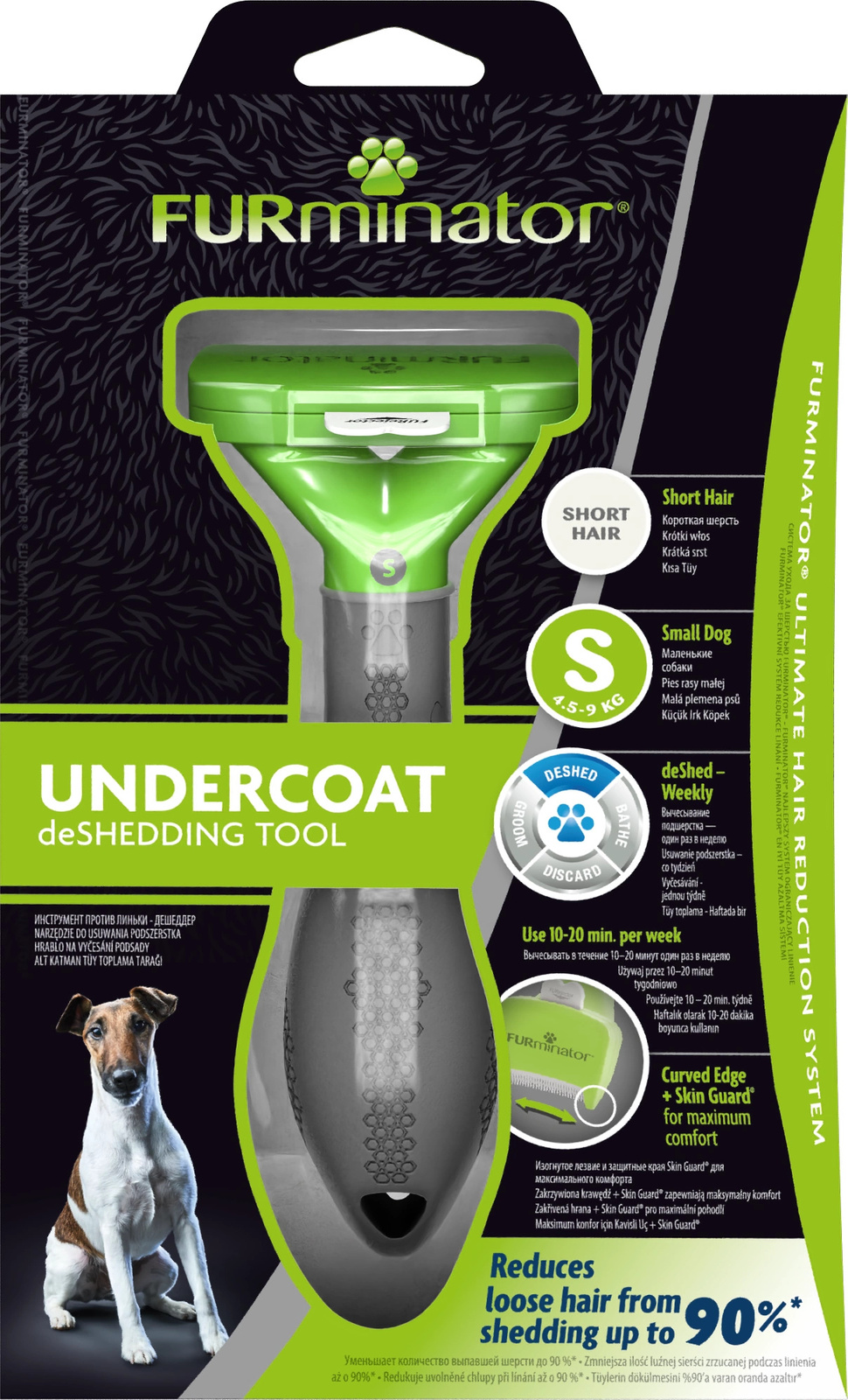 Narzędzie FURminator® do usuwania podszerstka dla krótkowłosych psów małych ras (S). Narzędzie zaprojektowane specjalnie dla psów o masie ciała 4.5-9 kg o sierści krótszej niż 5 cm. Produkt został zaprojektowany w celu promowania zdrowej skóry i sierści u zwierząt domowych oraz znacznego zmniejszenia ilości włosów, które każdego dnia zwierzę gubi i roznosi po domu. Pozwala skutecznie usuwać podszerstek i martwy włos, redukując linienie do 99%. Osłonięte krawędzie zapobiegają podrażnianiu skóry i chronią urządzenie podczas jego przechowywania dzięki technologii Edge Guard. Łatwy w obsłudze. Intuicyjne czyszczenie.