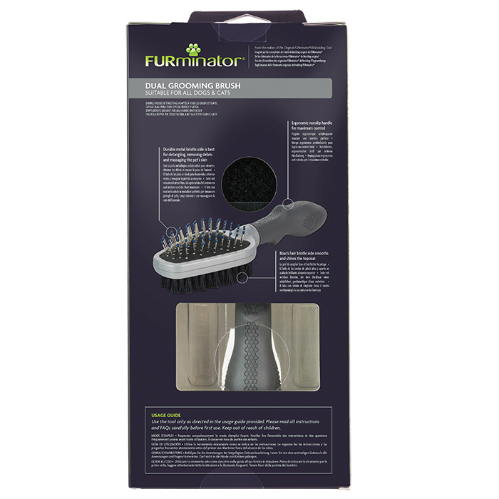 To profesjonalne narzędzie, które powala usunąć kołtuny, posklejaną sierść i martwy włos – w tym celu używa się twardej strony – oraz rozczesuje i wygładza sierść, nie uszkadzając jej – strona z miękkim włosiem. Szczotka posiada włosie dzika.