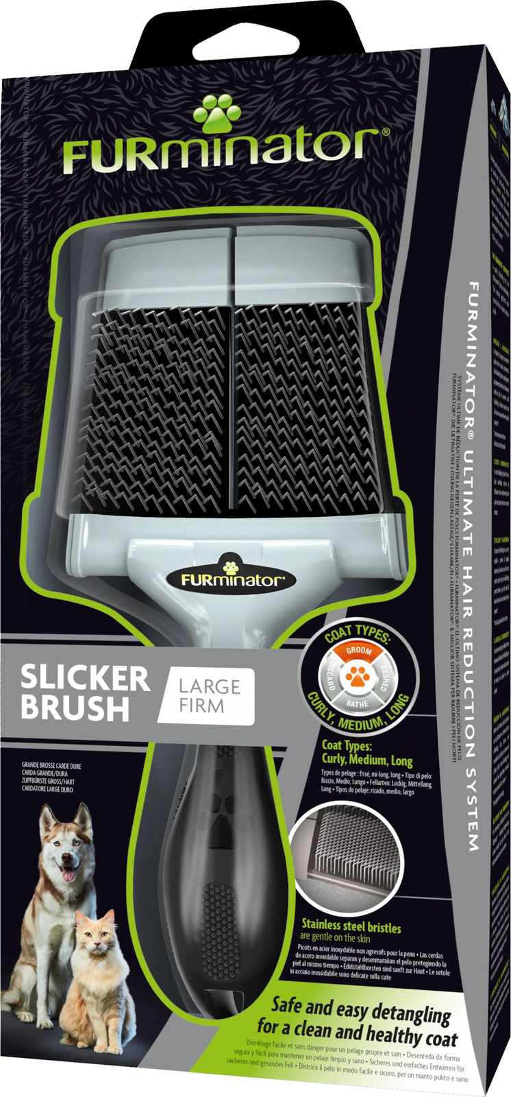 FURminator® Slicker Brush Large Firm to profesjonalnej jakości narzędzie do usuwania kołtunów i rozplątywania futra, nadające sierści ładne, gładkie i lśniące wykończenie. Zostało zaprojektowane specjalnie dla psów i kotów o sierści średniej długości, kręconej i długiej. Delikatna dla skóry dwustronna szczotka pudlówka ma włosie ze stali nierdzewnej w dwóch rodzajach: zakrzywione piny umożliwiają rozczesanie uporczywych kołtunów i supłów bez uszkadzania włosa, natomiast proste piny nadają sierści ładne, gładkie i lśniące wykończenie. Podwójna elastyczna konstrukcja główki dopasowuje się do naturalnych konturów głowy i ciała zwierzęcia, co sprawia, że pielęgnacja jest nie tylko łatwiejsza, ale też przyjemniejsza dla pupila. Ergonomiczny uchwyt umożliwia wygodne i bezpieczne użytkowanie.