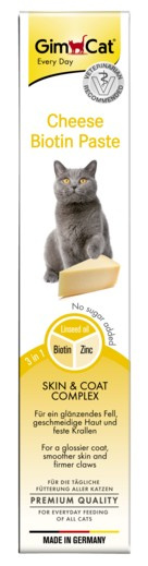 Gimpet Kase-Paste to lubiana przez koty pasta serowa z biotyną. Zawarte w niej witaminy wraz z biotyną korzystnie wpływają na kocią sierść, nadając jej połysk, sprężystość i poprawiają wybarwienie. Pastę można stosować np. w okresie linienia, kiedy włos prezentuje się gorzej.