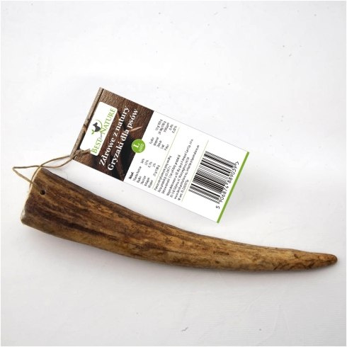 - W 100% naturalny i zdrowy gryzak dla psów. Przygotowywany jest ręcznie z poroży jeleni - tzw. zrzutów czyli poroży jeleni gubionych w polskich lasach wiosną przez dziko żyjące jelenie. Rozmiar L hard ma długość 15 cm i wagę 90-110 g.