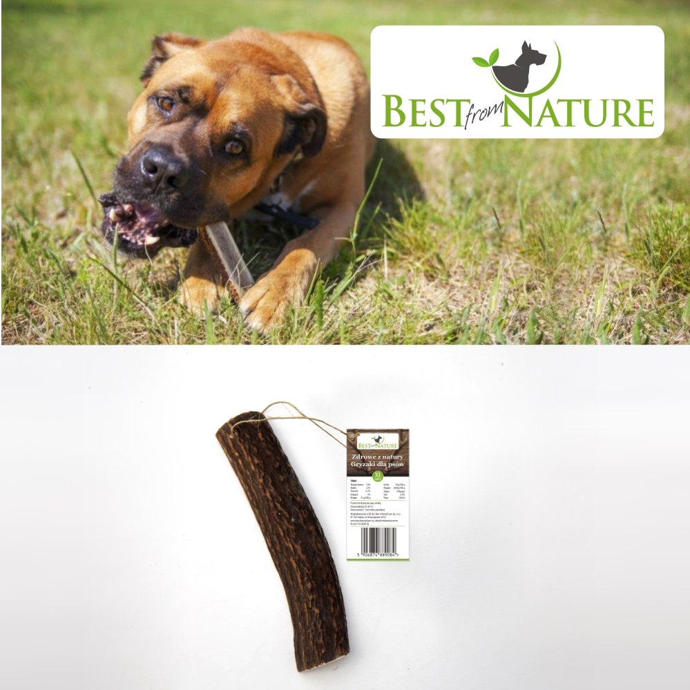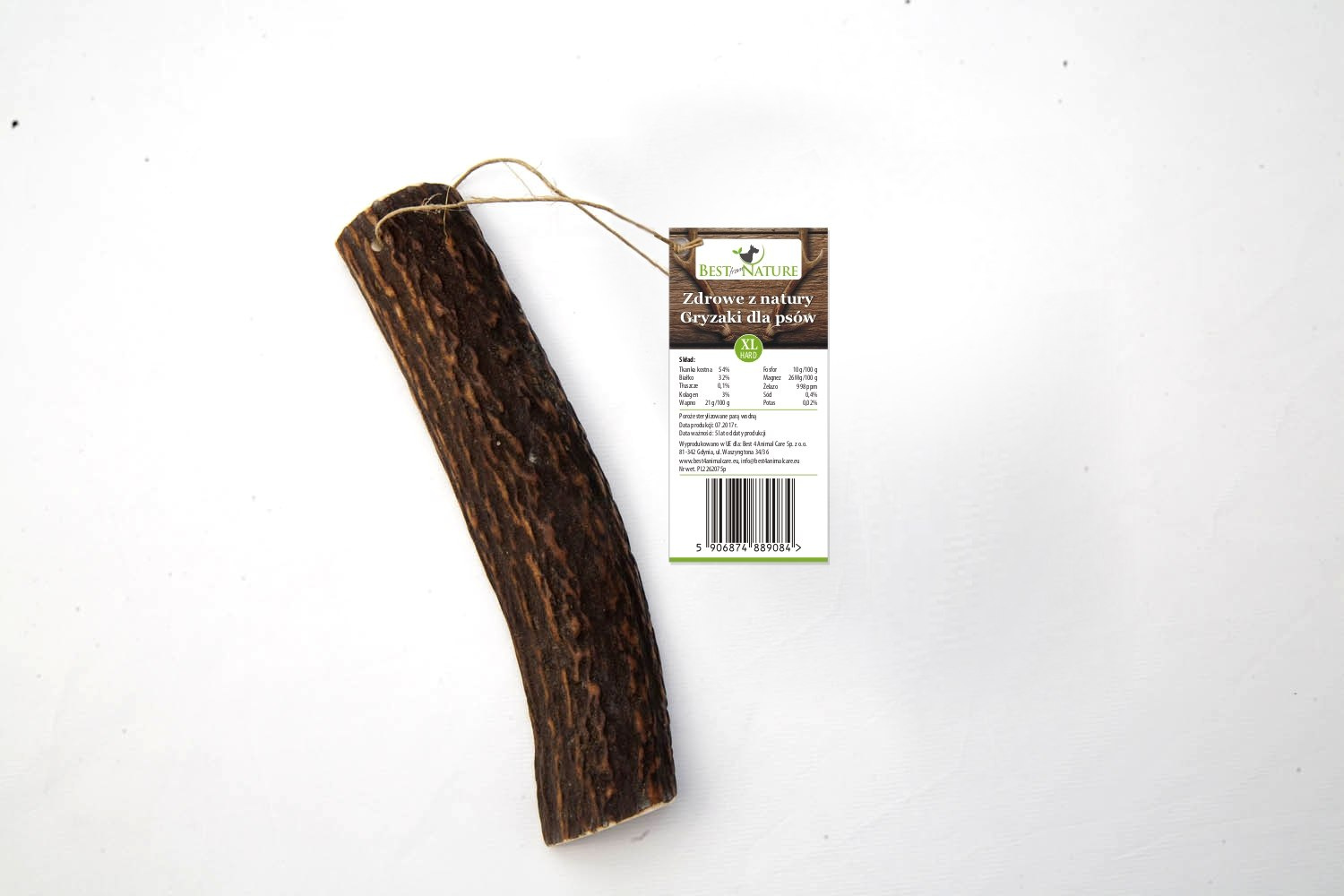 - W 100% naturalny i zdrowy gryzak dla psów. Przygotowywany jest ręcznie z poroży jeleni - tzw. zrzutów czyli poroży jeleni gubionych w polskich lasach wiosną przez dziko żyjące jelenie. Rozmiar XL hard ma długość 18 cm i wagę 90-130 g.