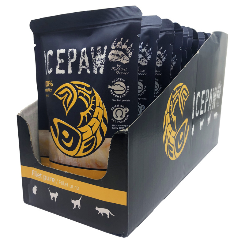 - Wszystkie mokre karmy ICEPAW powstają ze świeżych ryb, które są przetwarzane bezpośrednio po złowieniu. Po procesie obróbki karma jest delikatnie podgrzewana i pakowana w saszetki. Pozwala to zachować cenne witaminy i minerały oraz kwasy Omega-3.