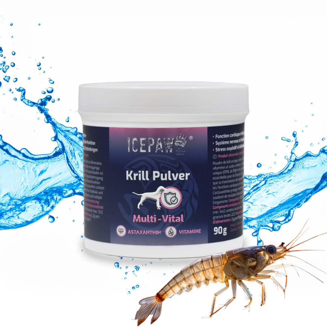 Pochodzący z Oceanu Arktycznego proszek z kryla jest bogaty w cenne minerały, witaminy i aminokwasy. Unikalne połączenie kwasów tłuszczowych omega-3 (EPA/DHA) i fosfolipidów jest niezbędne dla wielu funkcji organizmu, takich jak połączenia nerwowe, praca wątroby, serca i mięśni. Astaksantyna, będąca silnym przeciwutleniaczem, chroni psy przed stresem oksydacyjnym, wiąże wolne rodniki i naturalnie wspiera ich wydolność oraz wiele ważnych funkcji organizmu.