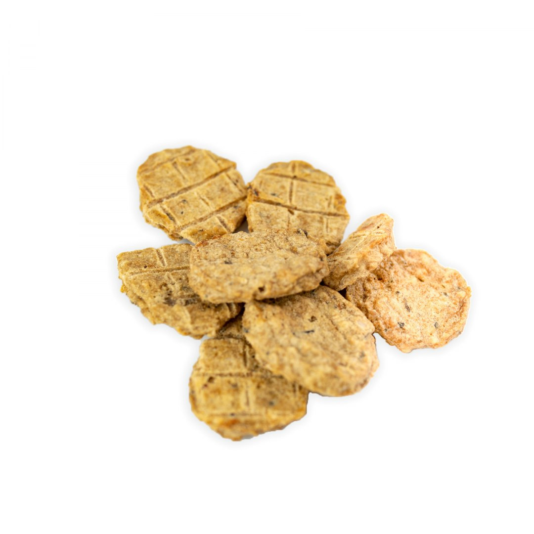 Ciasteczka z łososia i białych ryb to niezwykle smaczna przekąska, idealna do podania pomiędzy posiłkami lub nagroda. Delikatny proces wypiekania ciasteczek powoduje, że zachowany zostaje intensywny aromat i smak ryb tak uwielbiany przez psy. Ciasteczka są w 100% naturalne, bogate w witaminy i minerały oraz kwasy Omega-3. Do ich wypieku wykorzystywane są ryby delikatnie suszone powietrzem, co zapewnia optymalne zachowanie składników odżywczych, w tym kwasów Omega-3 wrażliwych na wysokie temperatury.