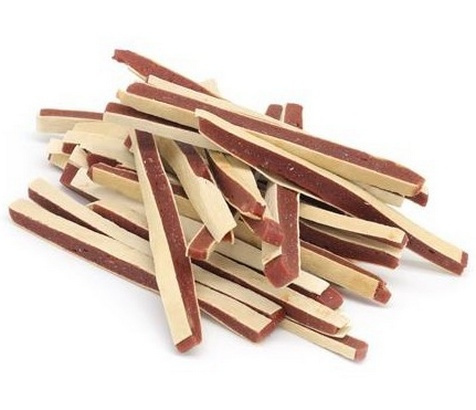 Paluszki z jagnięciną i rybą - Jagnięcina 35,9%, mięso z kaczki 25%, serca jagnięce 5%, dorsz 25%, białko sojowe i orzechowe, skrobia kukurydziana, gliceryna.