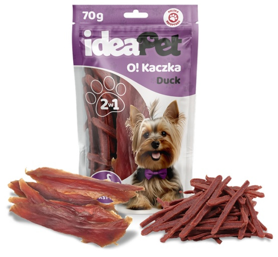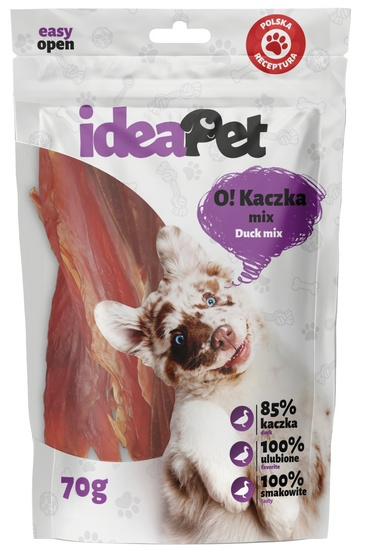 - IdeaPet O! Kaczka mix ideaPet O! Kaczka mix to smaczna przekąska dla psa, która zawiera paski i filety z kaczki. Kaczka to doskonałe źródło wysokiej jakości białka, które wspomaga rozwój i...