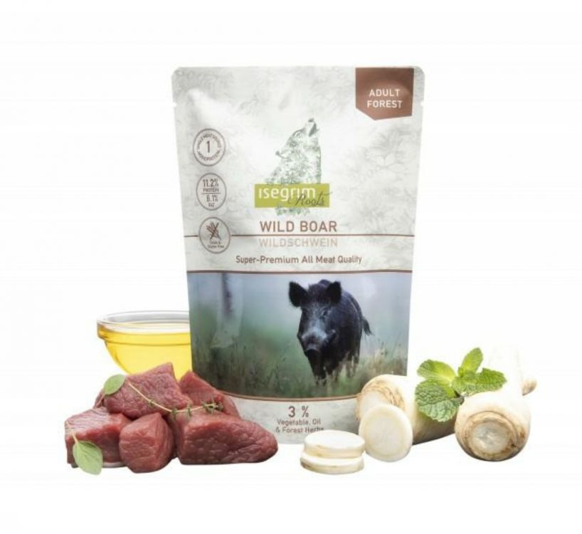 SKŁAD: 70 % mięso z dzika, 27 % bulion, 1,5 % pasternak, 1 % minerały, 0,3 % zioła leśne, 0,2 % olej lniany.