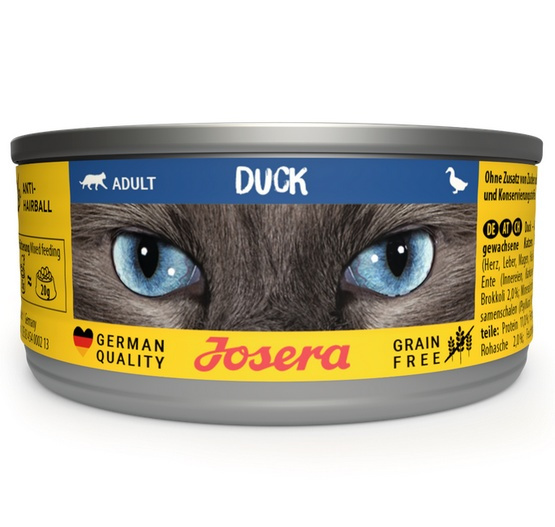 Gdy pupil je posiłek ze smakiem, jego opiekun też jest zadowolony. To kolejny powód, aby zadbać o pyszne urozmaicenie diety – na przykład wybierając naszą nową mokrą karmę Josera Duck w puszce! Smak kaczki zachęci do jedzenia nawet wybredne koty. Karma Duck w puszce dostarcza kotom większą dawkę płynów, co jest cenne dla kotów, które niechętnie piją wodę. Karma zawiera także olej z łososia, stanowiący źródło niezbędnych kwasów tłuszczowych omega-3.