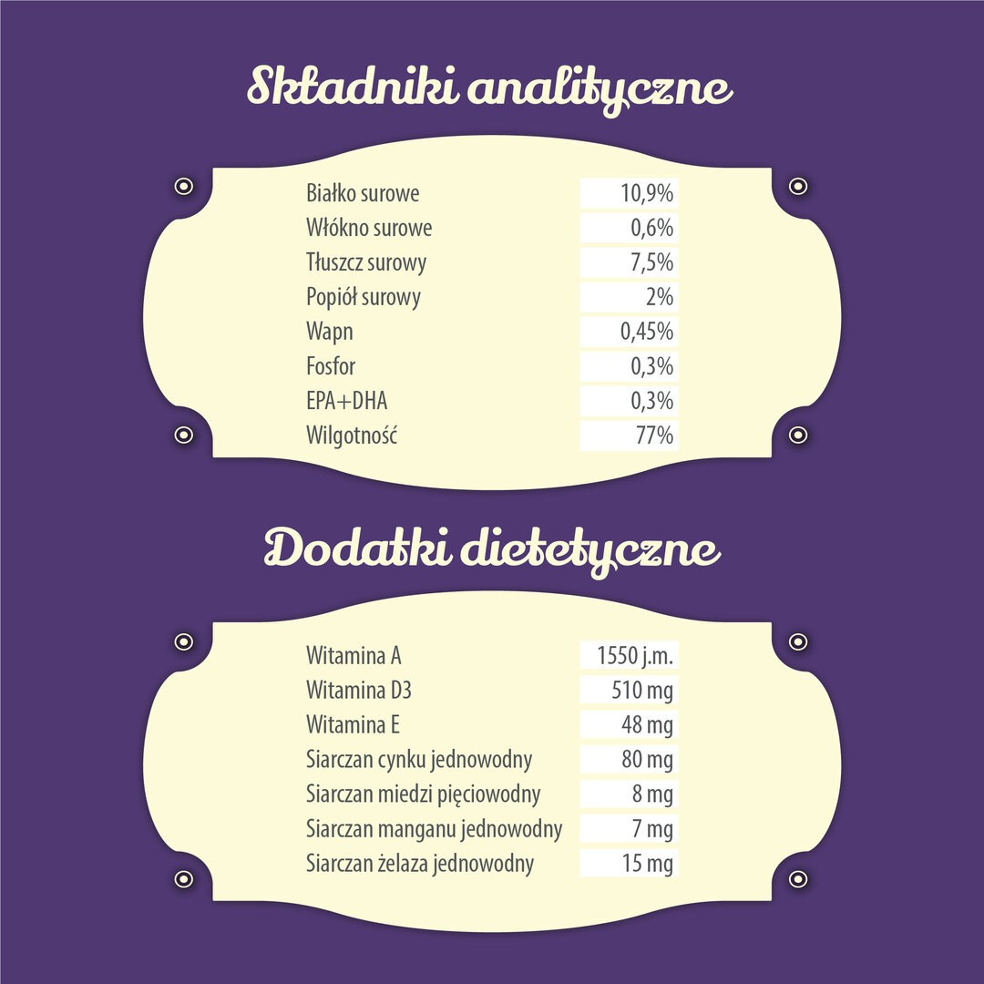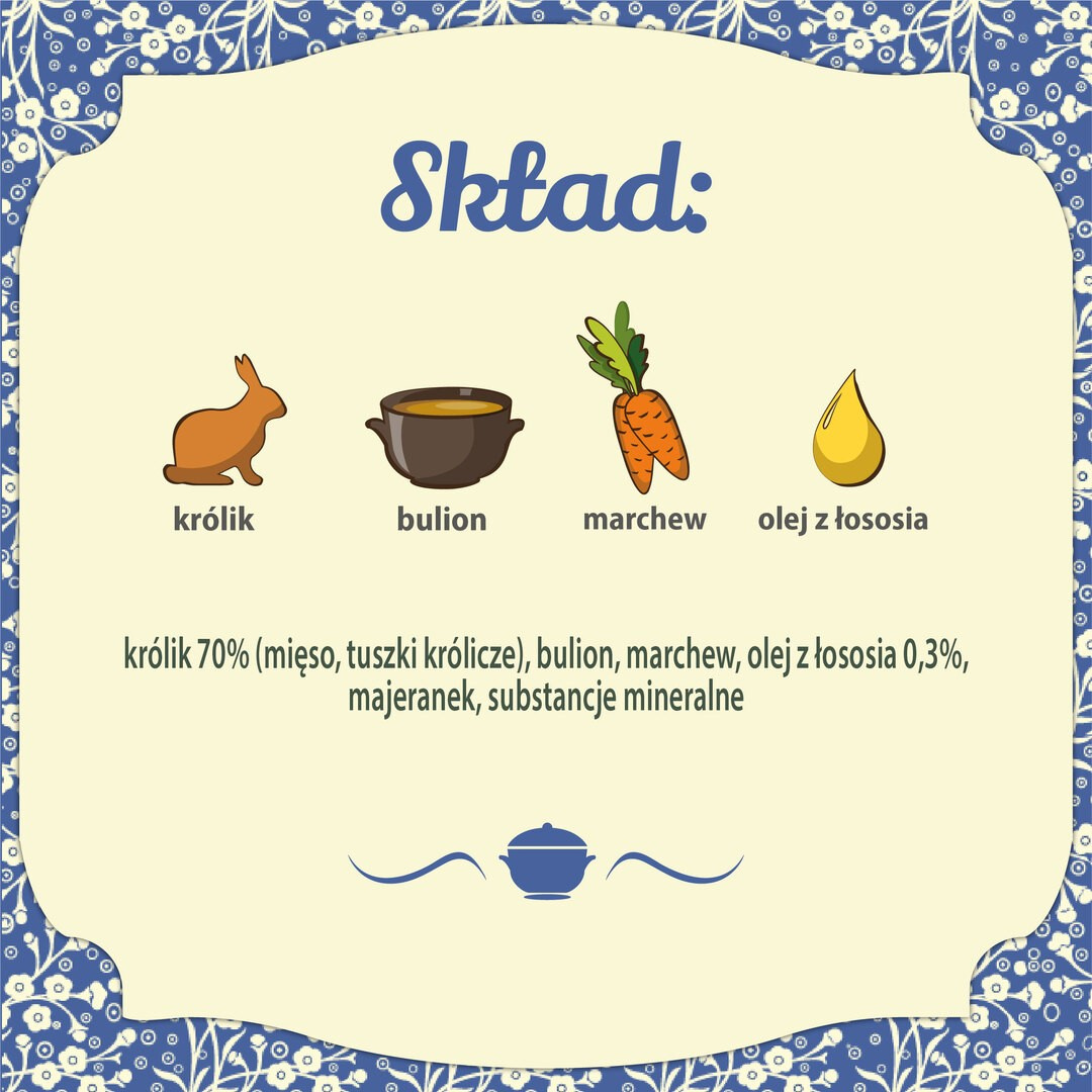 Skład: królik 70% (mięso, tuszki królicze), bulion, marchew, olej z łososia 0,3%, majeranek, substancje mineralne.