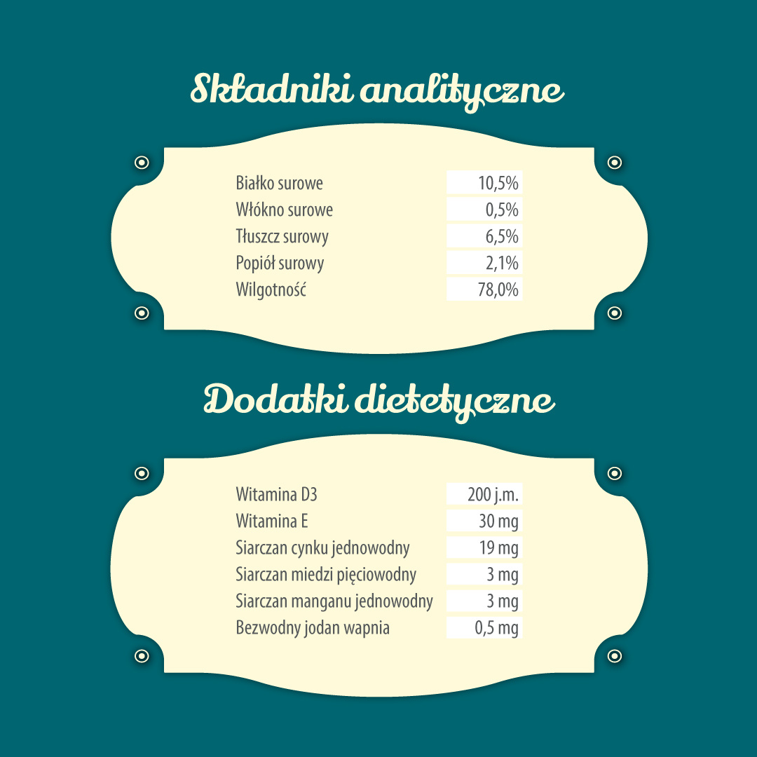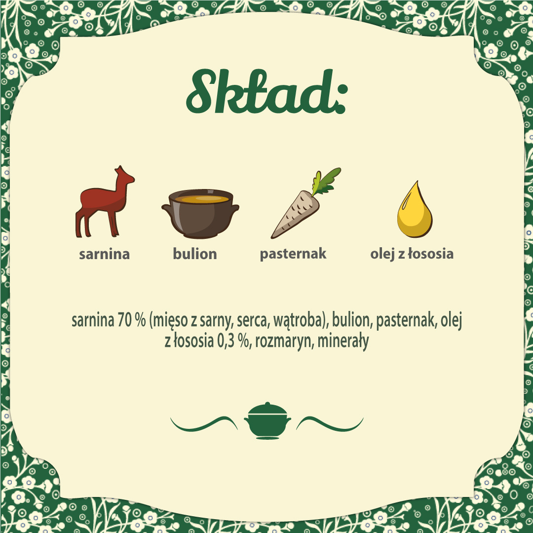 Skład: sarnina 70 % (mięso z sarny, serca, wątroba), bulion,