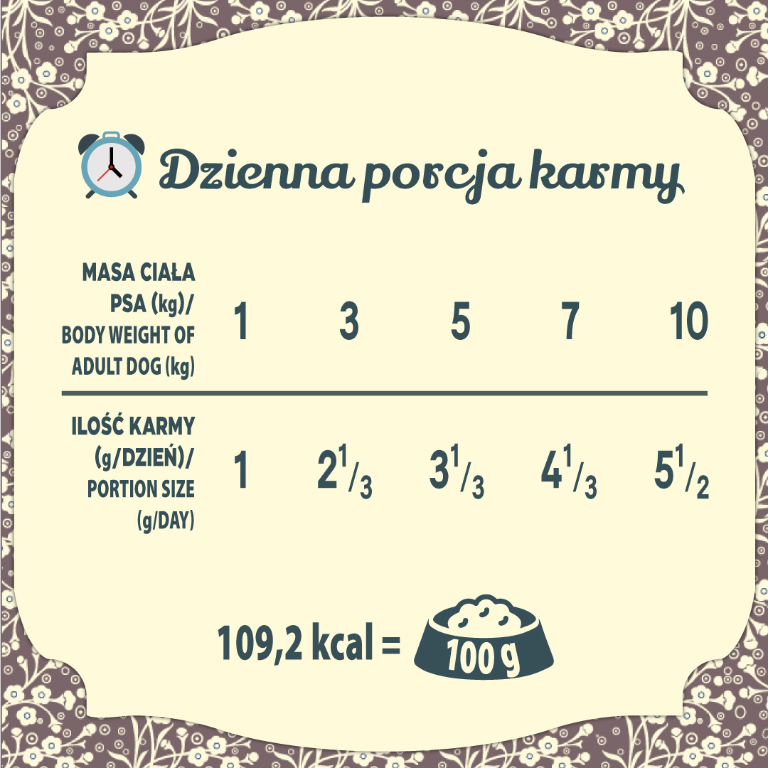 bulion, marchew, olej z łososia 0,3 %, rozmaryn, minerały.