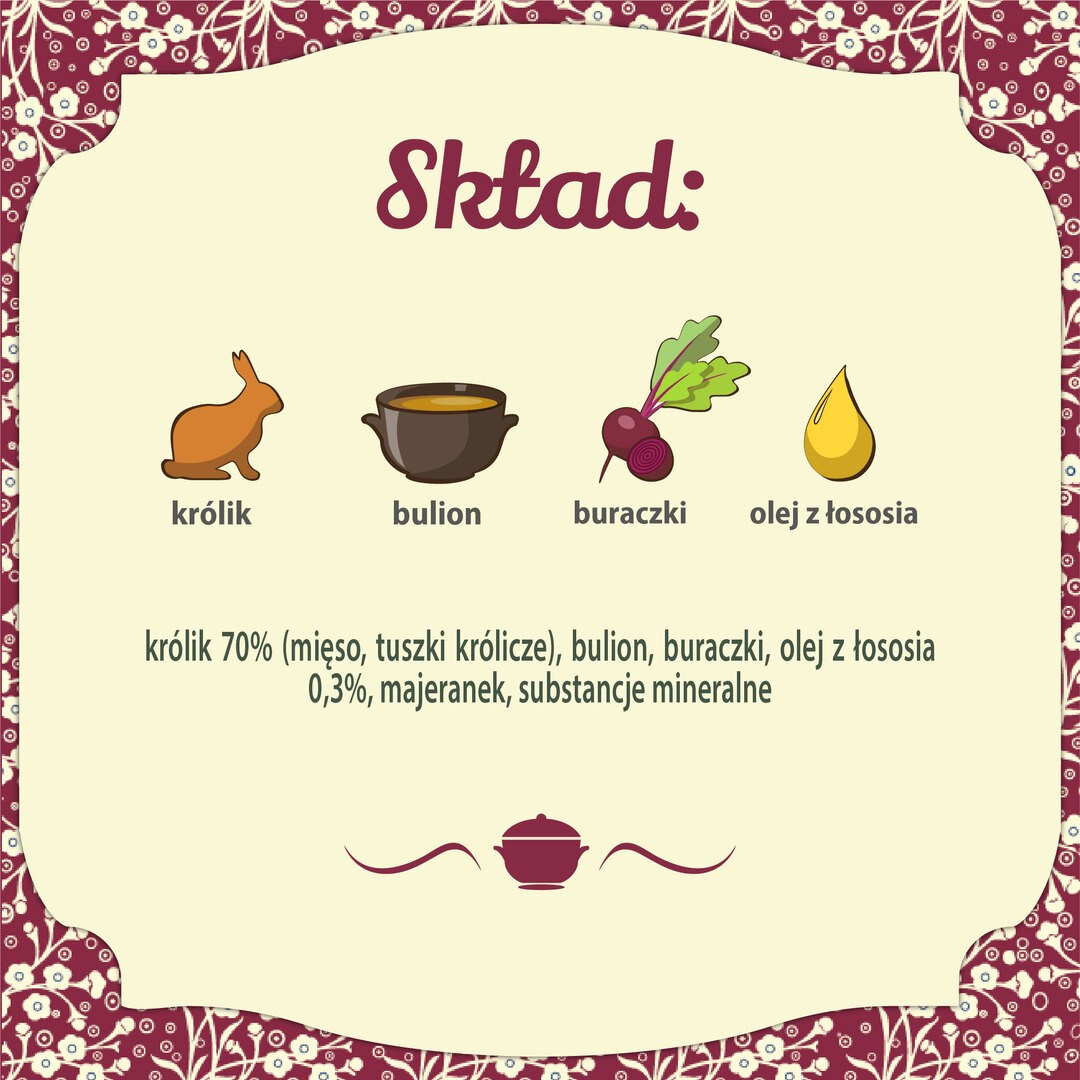 Skład: królik 70% (mięso, tuszki królicze), bulion, buraczki, olej z łososia 0,3%, majeranek, substancje mineralne.
