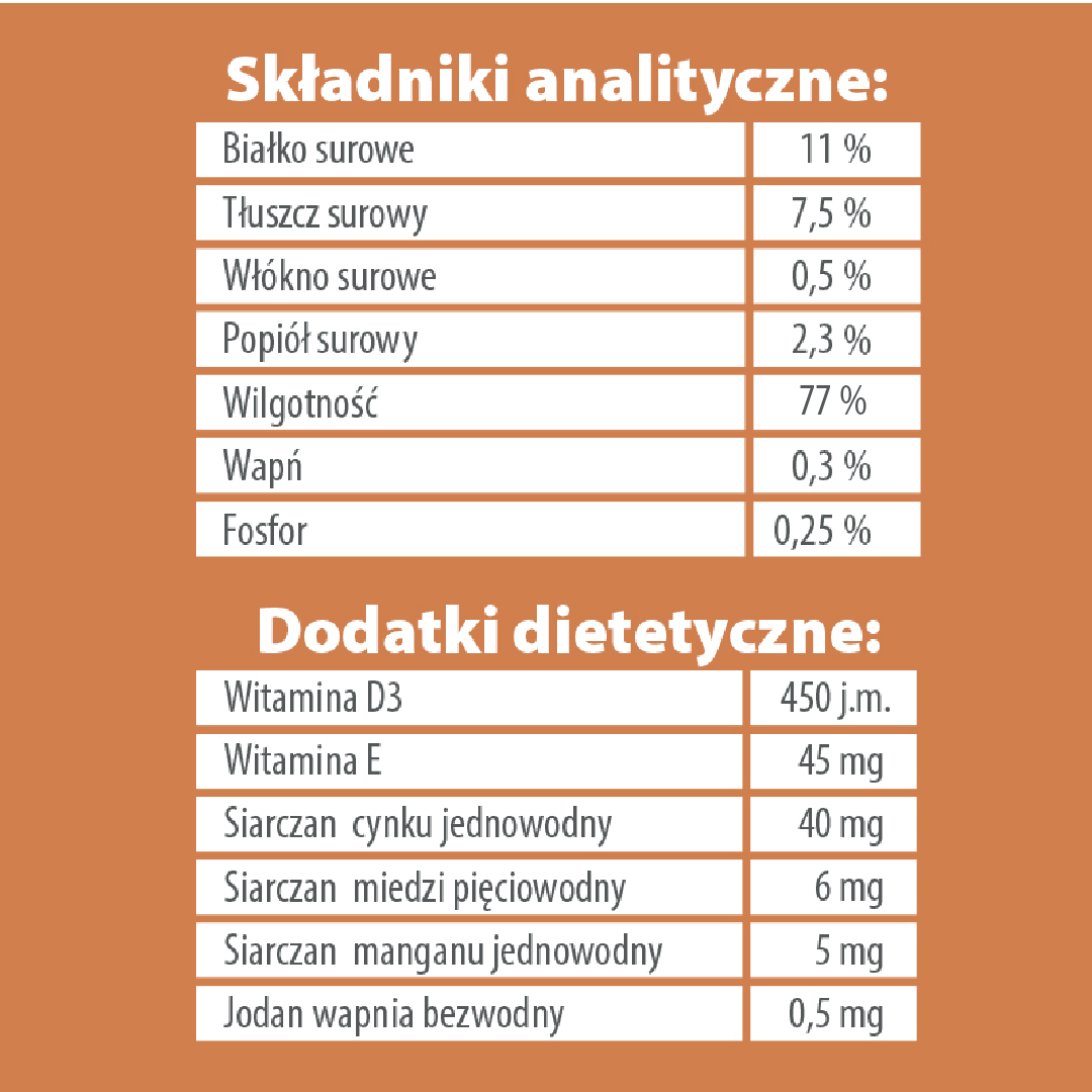 Skład: królik 35% (mięso, tuszki królicze), wieprzowina 20% (mięso wieprzowe, płuca, przełyki, wątróbka, serca), kurczak 12% (mięso z kurczaka, wątróbka, serca, żołądki), bulion, ziemniaki 4%, dynia 2%, olej z łososia 0,3%, substancje mineralne.
