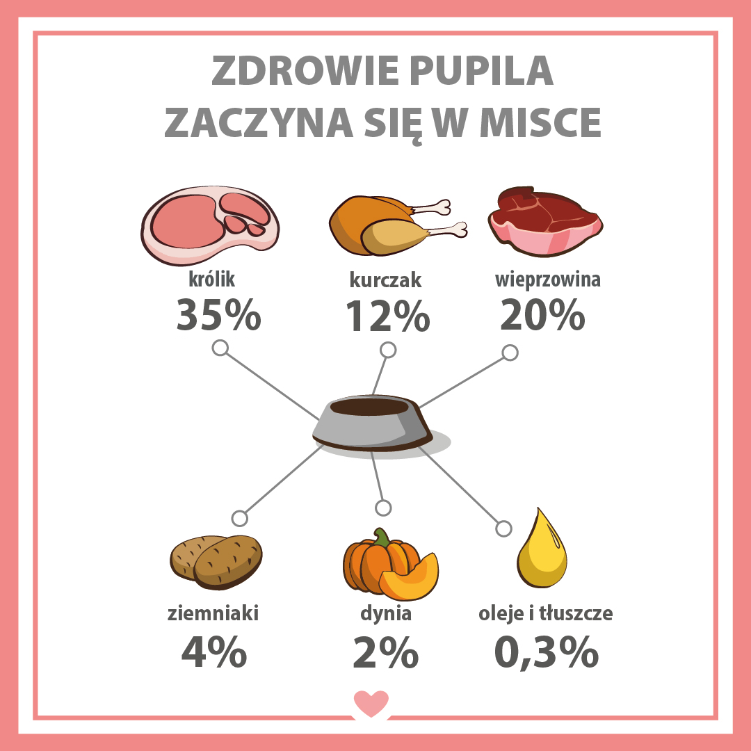 - 35% królika, 20% wieprzowiny, 12% kurczaka