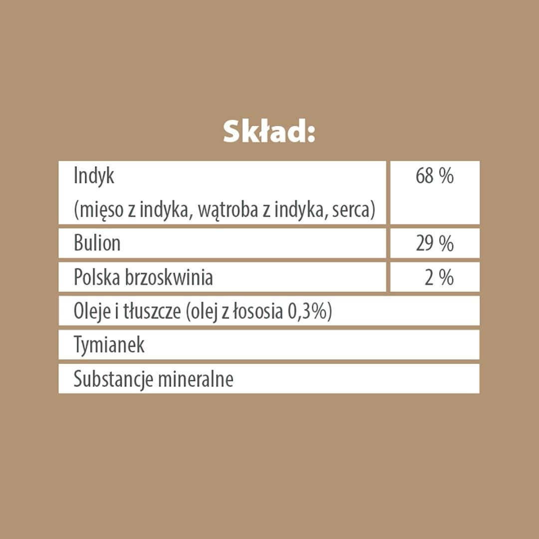 SKŁAD: indyk 68% (mięso z indyka, wątroba z indyka, serca),