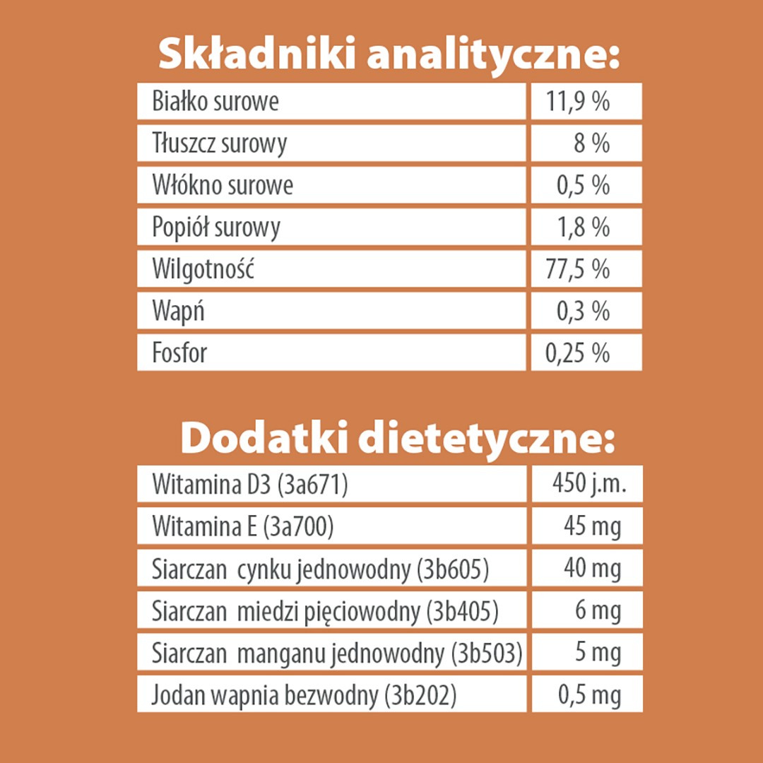 - Receptura bazująca w 100% na mięsnych surowcach, w tym 68% mięsa z kaczki