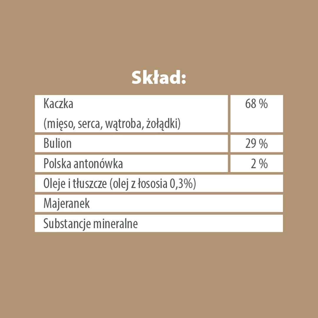 SKŁAD: kaczka 68% (mięso, serca, wątroba, żołądki), bulion 29%, polska antonówka 2% oleje i tłuszcze (olej z łososia 0,3%), majeranek, substancje mineralne.