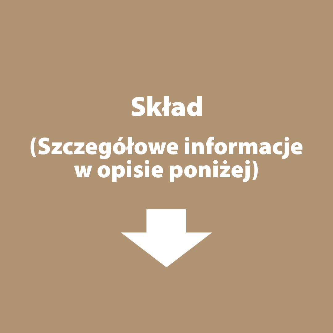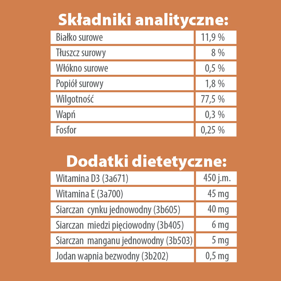 Skład: kaczka 68% (mięso, serca, wątroba, żołądki), bulion 29%, polska antonówka 2%, oleje i tłuszcze (olej z łososia 0,3%), majeranek, substancje mineralne.