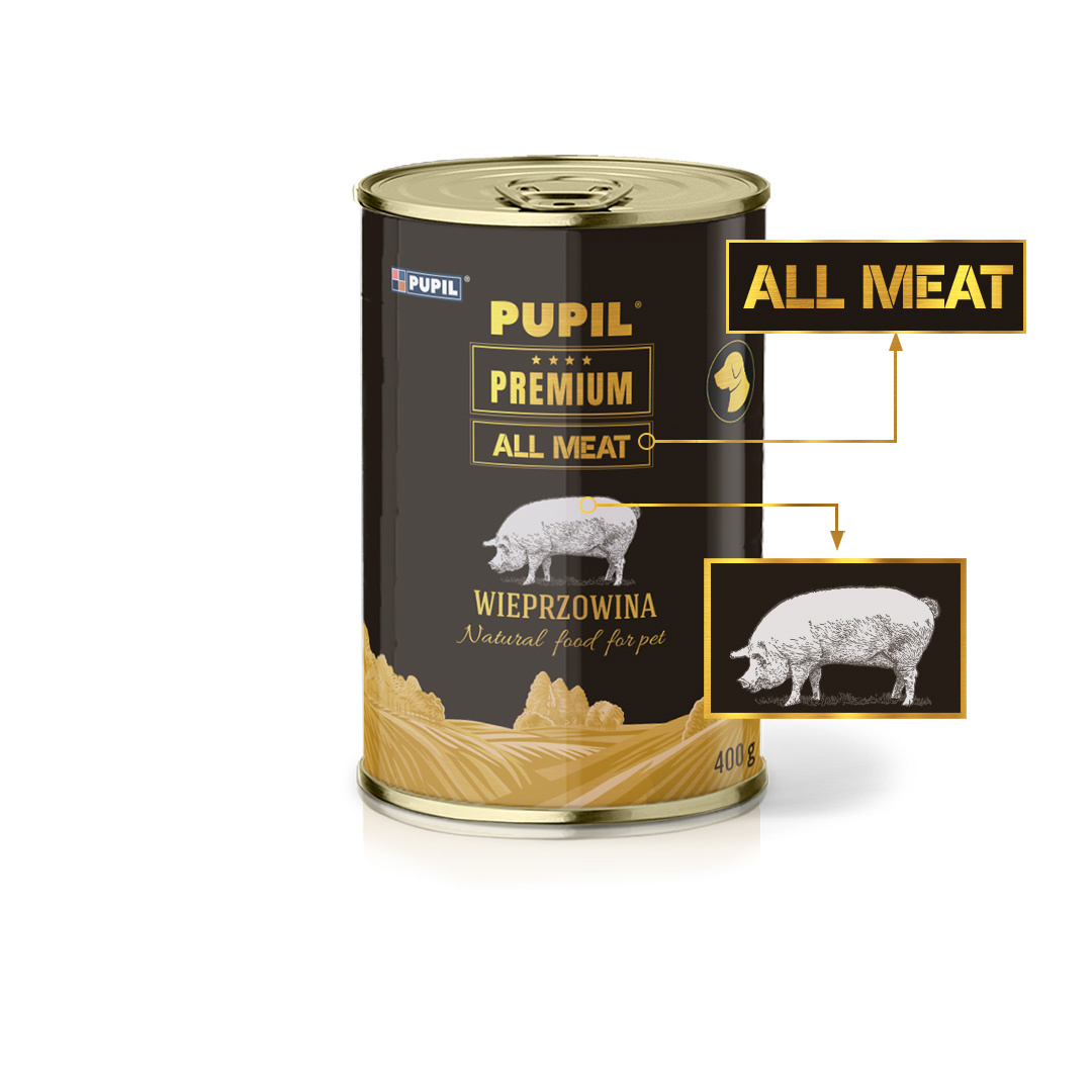 - Karma mokra dla psa PUPIL Premium ALL MEAT GOLD wieprzowina 400g to kompletny, zrównoważony posiłek przygotowany z myślą o psach.