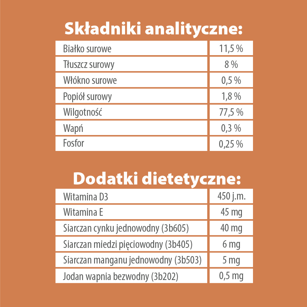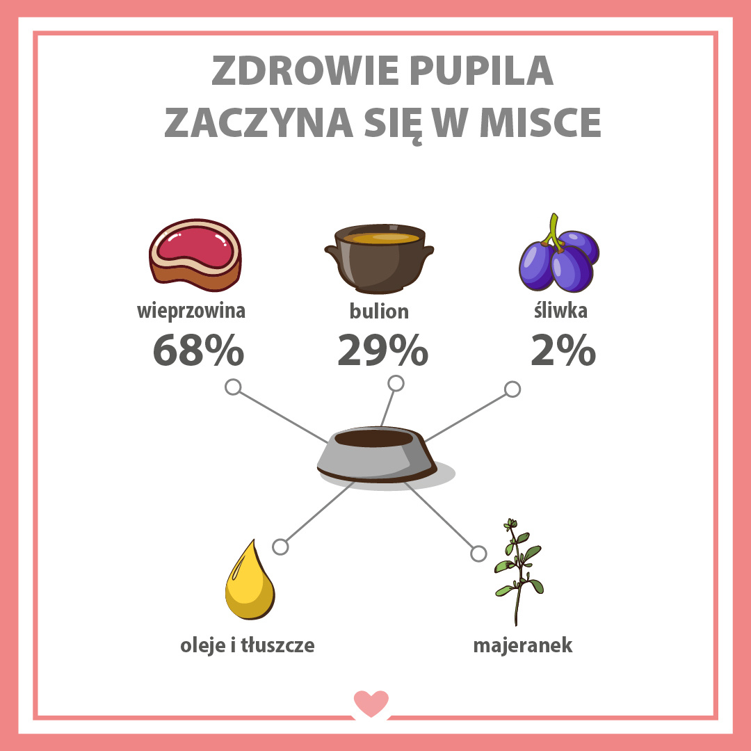 Skład: wieprzowina 68% (mięso wieprzowe, wątróbka), bulion 29%, polska śliwka 2%, olej z łososia 0,3%, majeranek, substancje mineralne.