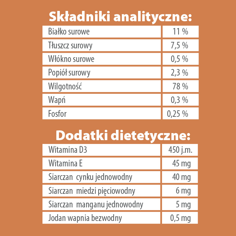 - 100% MIĘSNA KARMA z NAJWYŻSZEJ JAKOŚCI NATURALNYCH, POLSKICH SUROWCÓW, bez glutenu, konserwantów i sztucznych barwników.