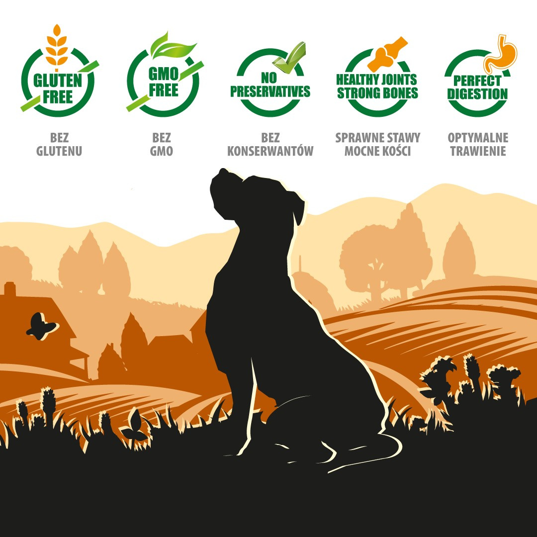 Skład: 55% mięsa i produktów pochodzenia zwierzęcego: indyk45% (korpusy, skrzydła, szyje, mięso, serca), jagnięcina 10% (płuca, przełyki, wątroba, serca), białko ziemniaczane, substancje mineralne.