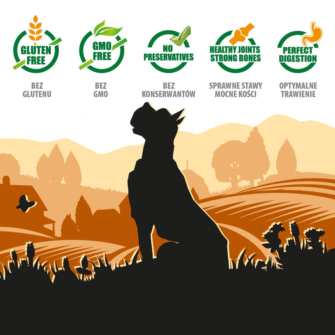 Skład: 55% mięsa i produktów pochodzenia zwierzęcego: indyk45% (korpusy, skrzydła, szyje, mięso, serca), jagnięcina 10% (płuca, przełyki, wątroba, serca), białko ziemniaczane, substancje mineralne.