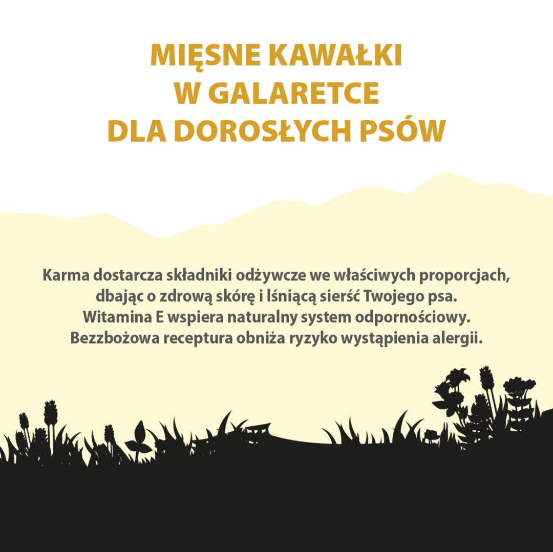 - Pełnoporcjowa karma mokra przeznaczona dla psów dorosłych wszystkich ras