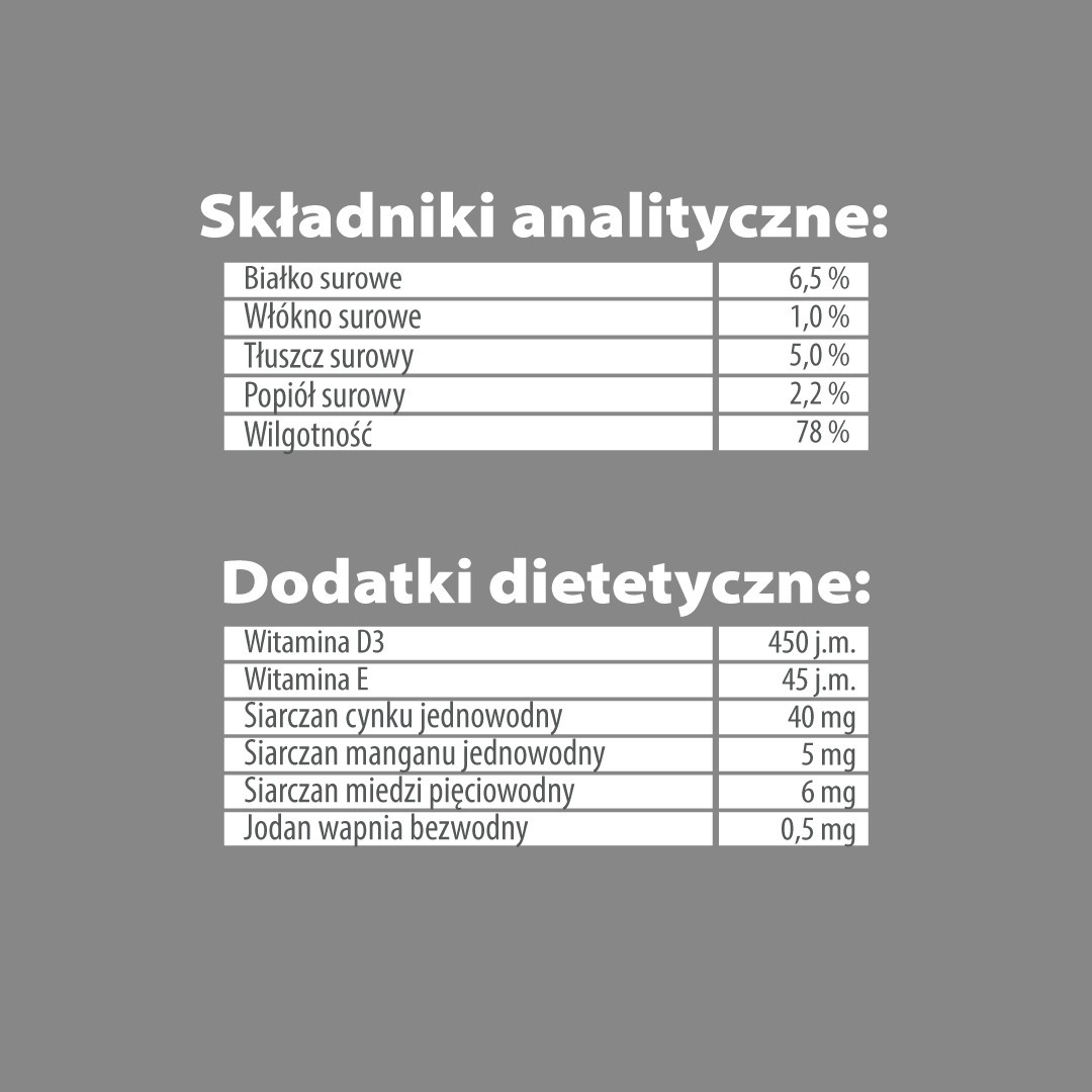 Skład: insekty 50 % (larwy Hermetia Illucens), bulion 35 %, ziemniaki 6 %, pasternak 4 %, marchew 4 %, olej z łososia 0,3 %, substancje mineralne.