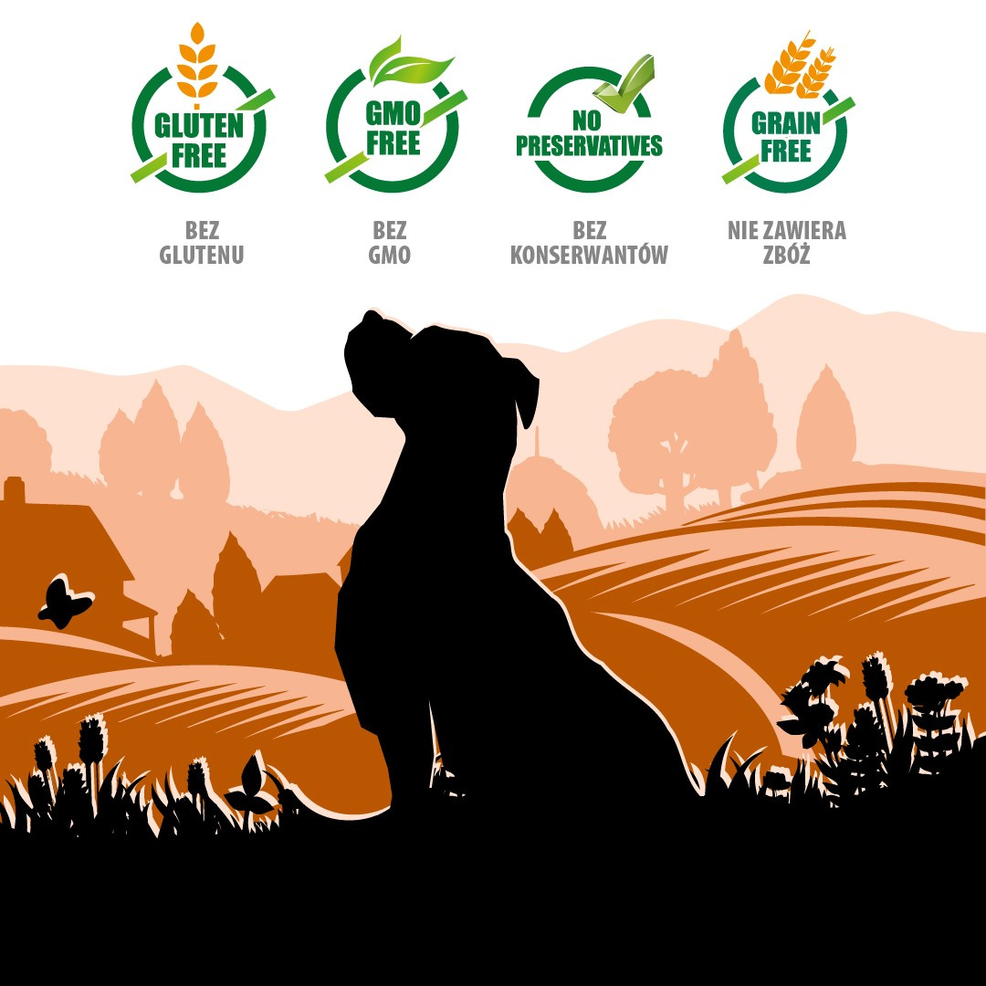 Mięso użyte w recepturze karmy ma korzystną proporcję tłuszczu i białka oraz zawiera dobrze przyswajalne żelazo. Witamina D3 odpowiada za prawidłową kondycję kości i zębów, a witamina E opóźnia procesy starzenia się organizmu, zwalczając wolne rodniki. Karma nie zawiera konserwantów, sztucznych barwników ani dodatków, a wszystkie użyte surowce są w 100% naturalne.