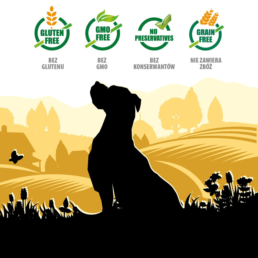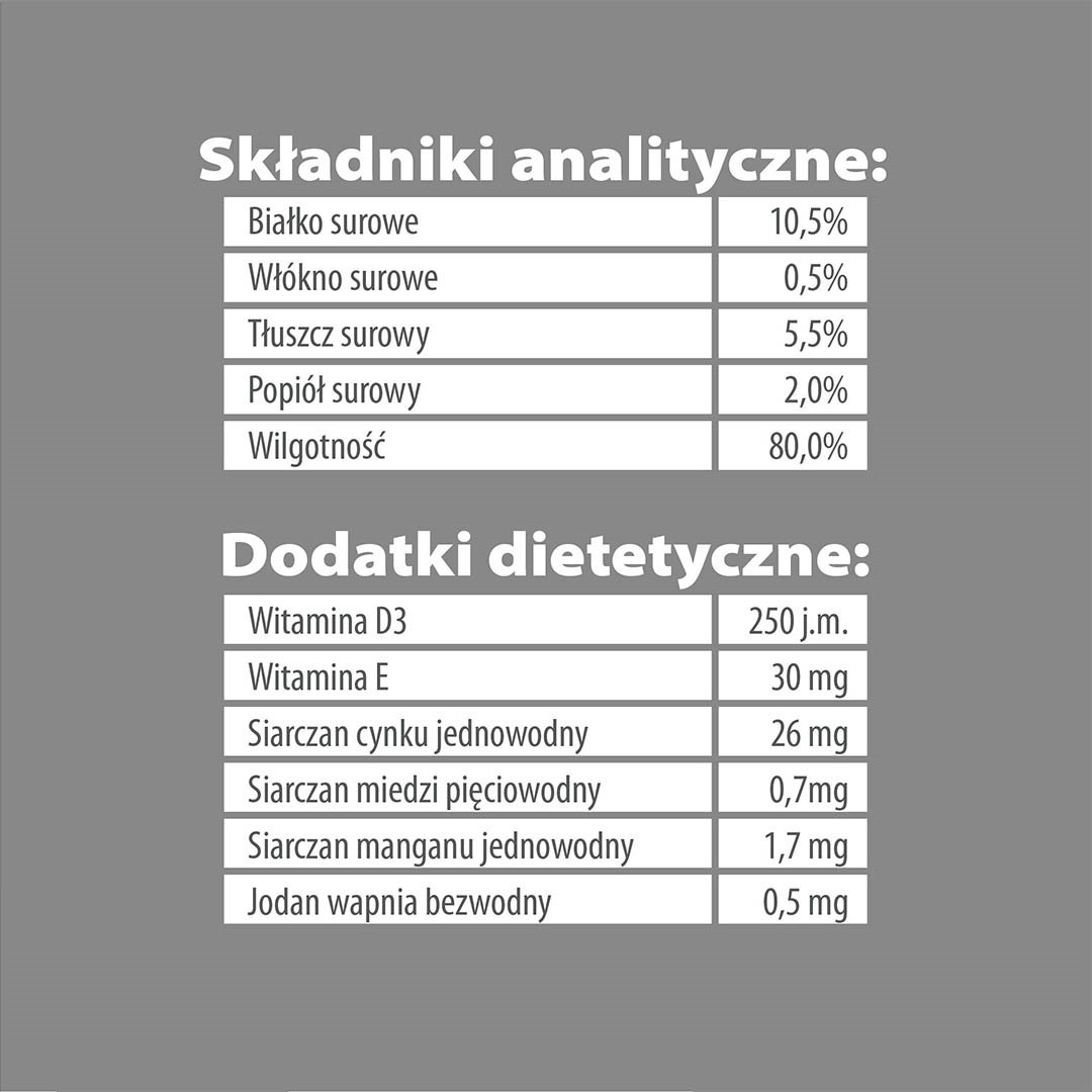 Mięso użyte w recepturze karmy ma korzystną proporcję tłuszczu i białka oraz zawiera dobrze przyswajalne żelazo. Witamina D3 odpowiada za prawidłową kondycję kości i zębów, a witamina E opóźnia procesy starzenia się organizmu, zwalczając wolne rodniki. Karma nie zawiera konserwantów, sztucznych barwników ani dodatków, a wszystkie użyte surowce są w 100% naturalne.