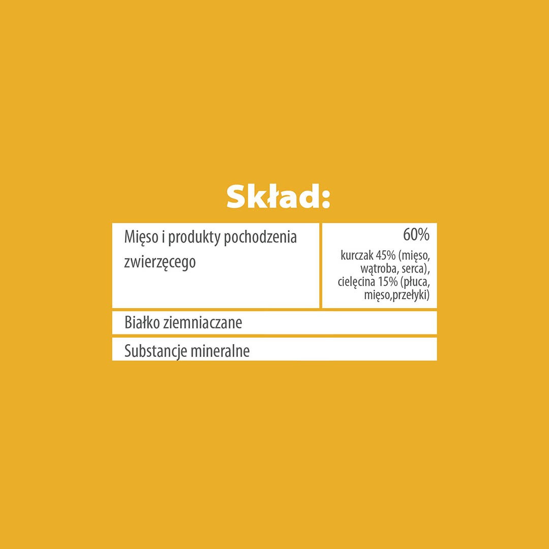 Skład: 60% mięsa i produktów pochodzenia zwierzęcego: kurczak 45% (mięso, wątroba, serca), cielęcina 15% (płuca, mięso, przełyki), białko ziemniaczane, substancje mineralne.