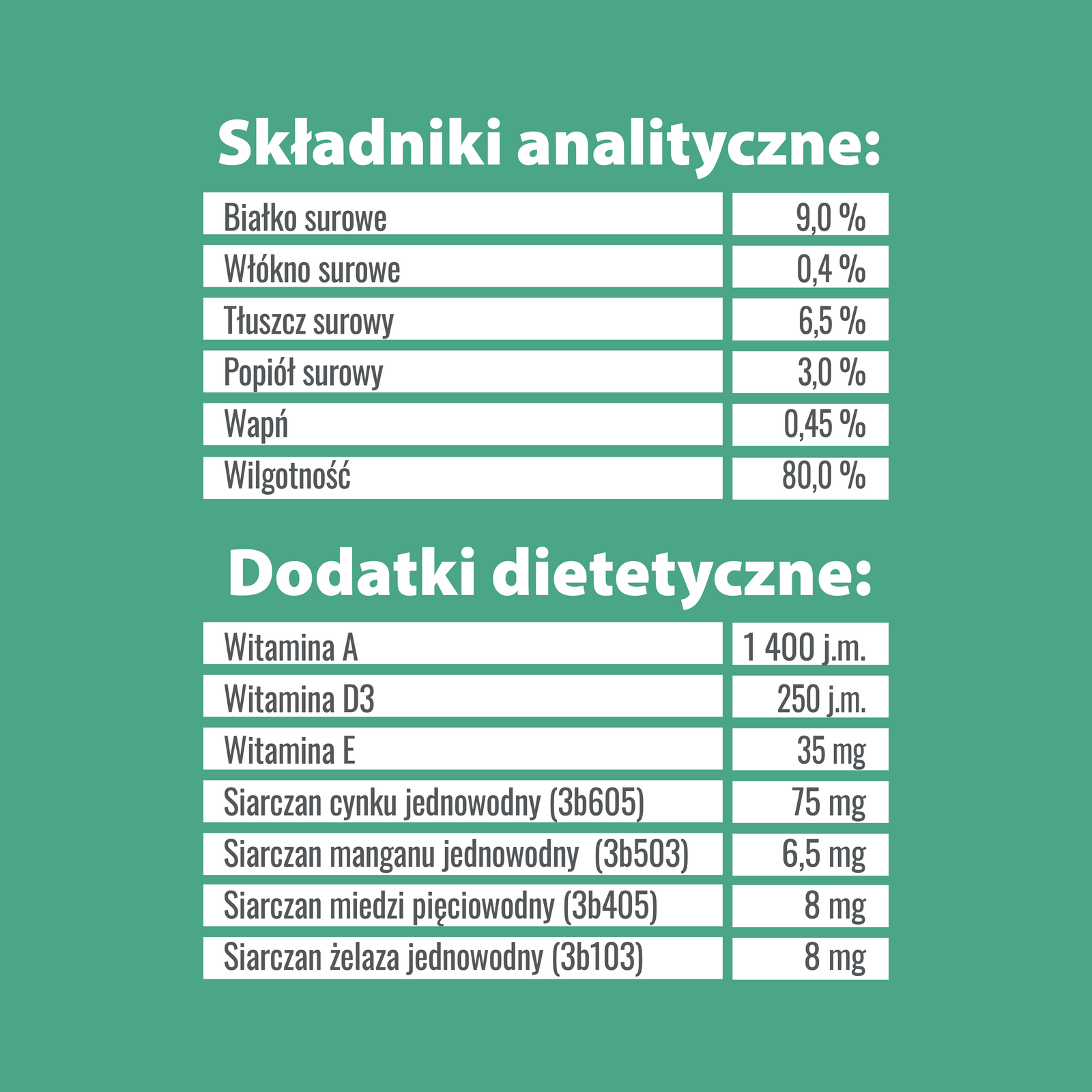 Skład: mięso i produkty pochodzenia zwierzęcego 54% (kurczak 14%), roślinne ekstrakty białkowe, oleje i tłuszcze (olej z łososia 0,2%), substancje mineralne.