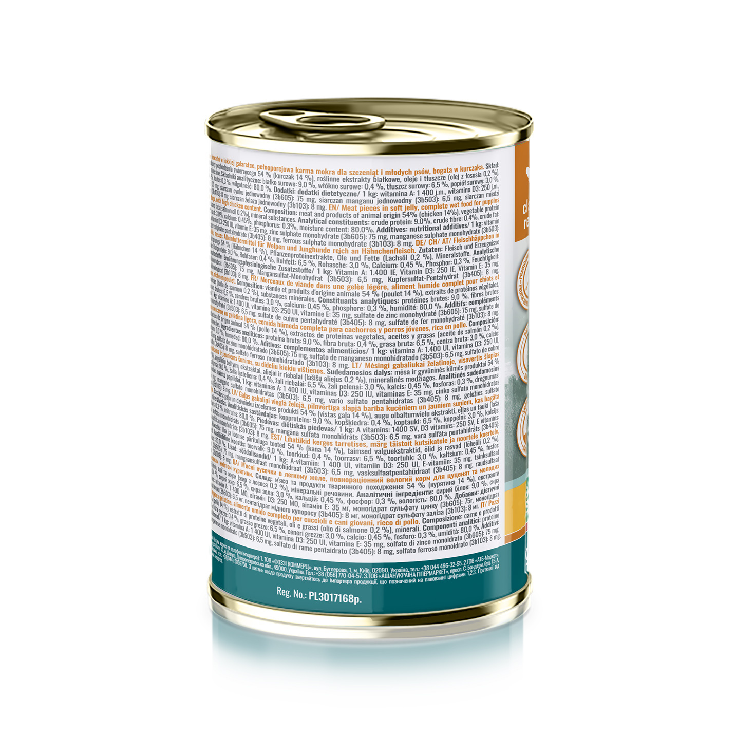 Pełnoporcjowa karma mokra PUPIL PRIME bogata w kurczaka to znakomity pierwszy stały posiłek dla szczeniąt i młodych psów wszystkich ras. Mięsne kawałki w delikatnej galaretce dostarczają psu niezbędnych składników odżywczych, witamin i minerałów, które wspierają zdrowy wzrost i rozwój. Kurczak jest łatwo przyswajalnym źródłem białka, nie obciążającym delikatnego układu trawiennego młodego zwierzęcia. Dodatek oleju z łososia wspiera prawidłowy rozwój układu nerwowego oraz przeciwdziała chorobom krążenia.