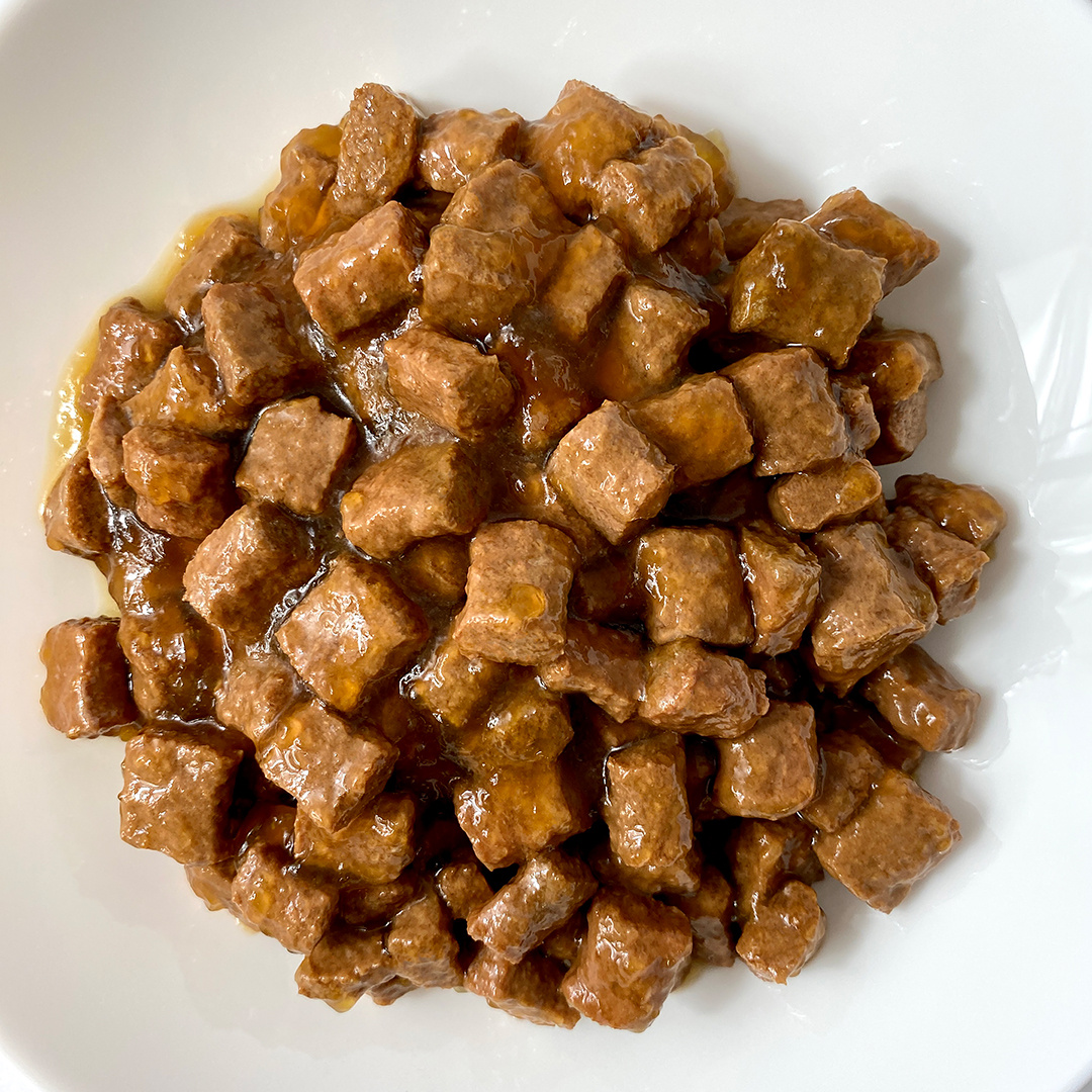 - Pełnoporcjowy posiłek dla dorosłych psów w postaci mięsnych kawałków w lekkiej galaretce