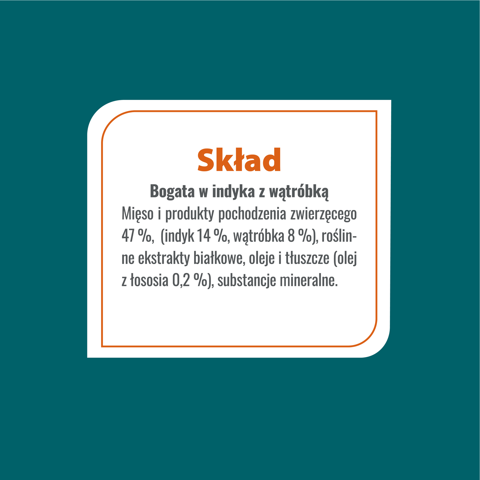 Skład: Mięso i produkty pochodzenia zwierzęcego 47% (indyk 14%, wątróbka 8%), roślinne ekstrakty białkowe, oleje i tłuszcze (olej z łososia 0,2%), substancje mineralne.