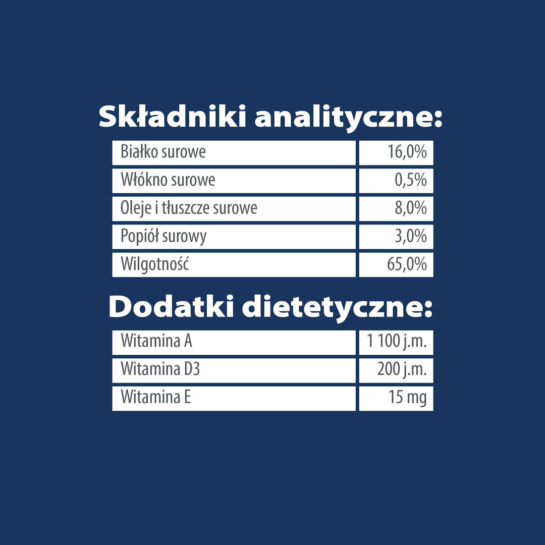 Składniki analityczne: Białko surowe: 16,0%, Włókno surowe: 0,5%, Oleje i tłuszcze surowe: 8,0%, Popiół surowy: 3,0%, Wilgotność: 65,0%
