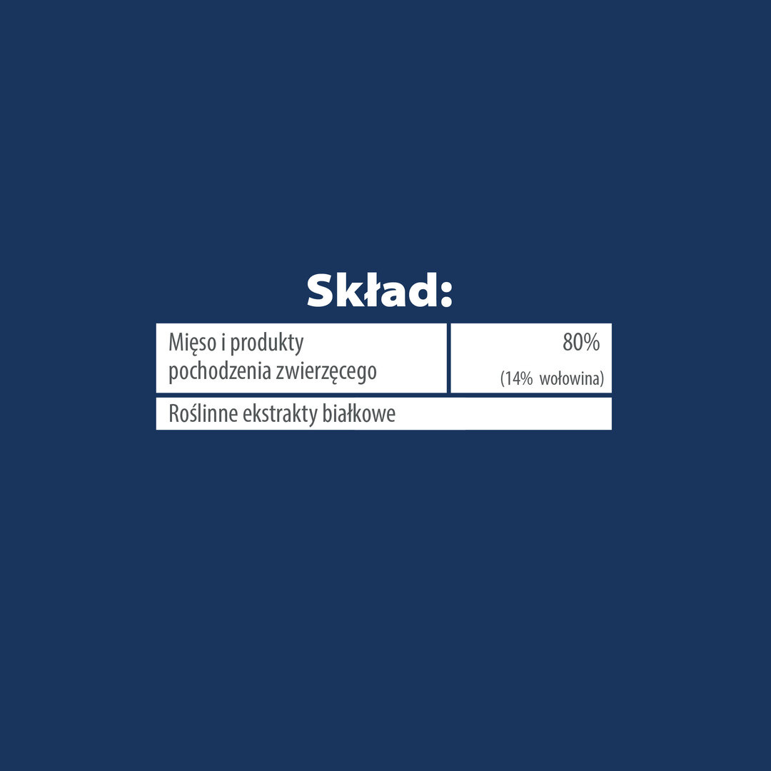 - 80% mięsa i produktów pochodzenia zwierzęcego (14% wołowina), roślinne ekstrakty białkowe.