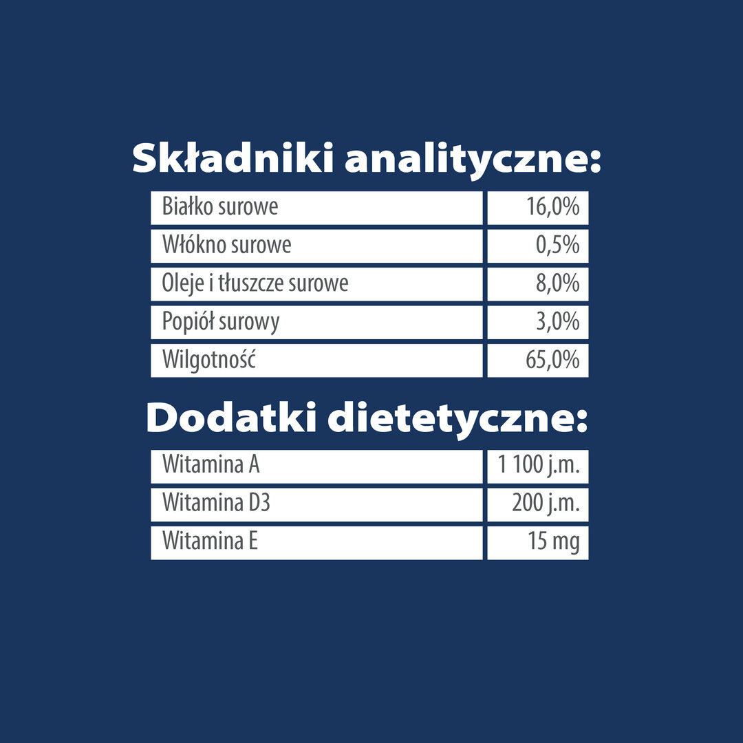 Składniki analityczne: Białko surowe: 16,0%, Włókno surowe: 0,5%, Oleje i tłuszcze surowe: 8,0%, Popiół surowy: 3,0%, Wilgotność: 65,0%