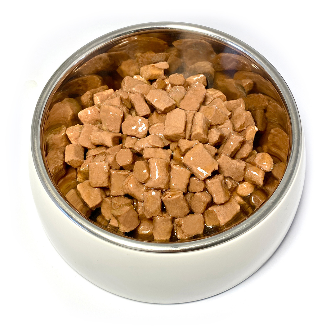 - Pełnoporcjowy posiłek dla dorosłych psów w postaci mięsnych kawałków w pysznym sosie