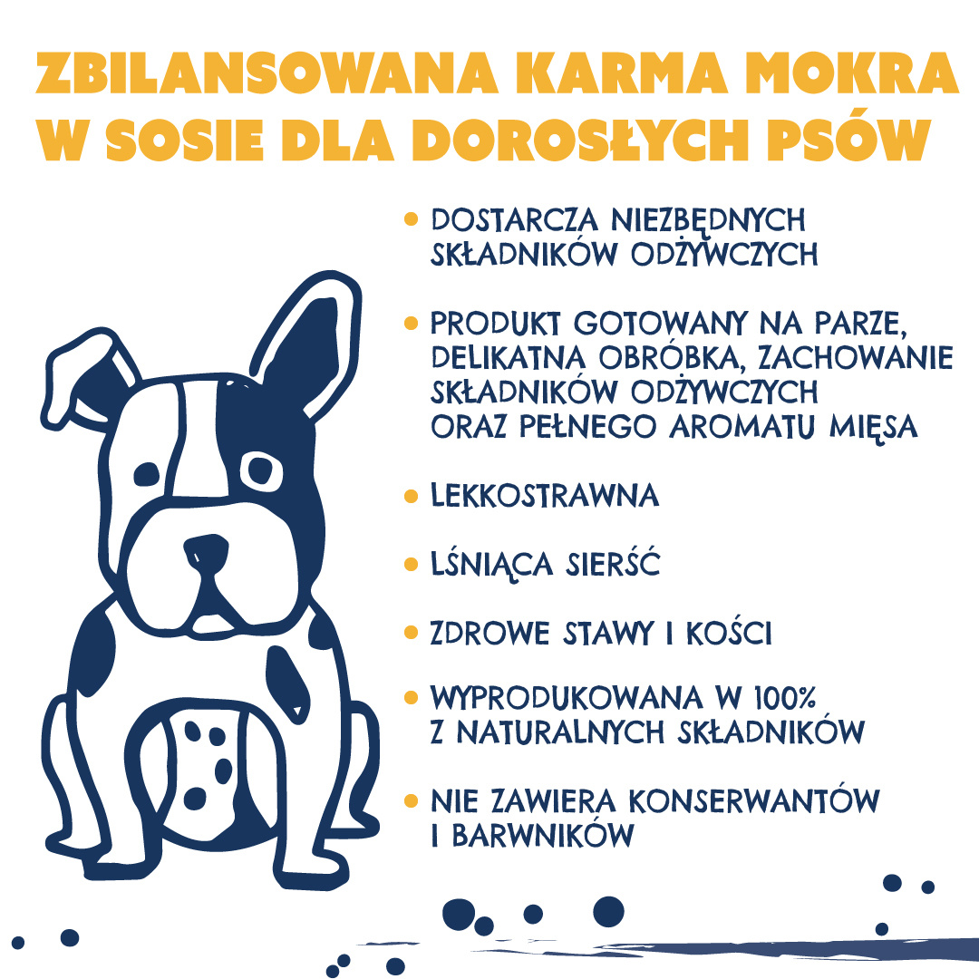 - Pełnoporcjowa karma mokra dla dorosłych psów. Produkt bogaty w drób.