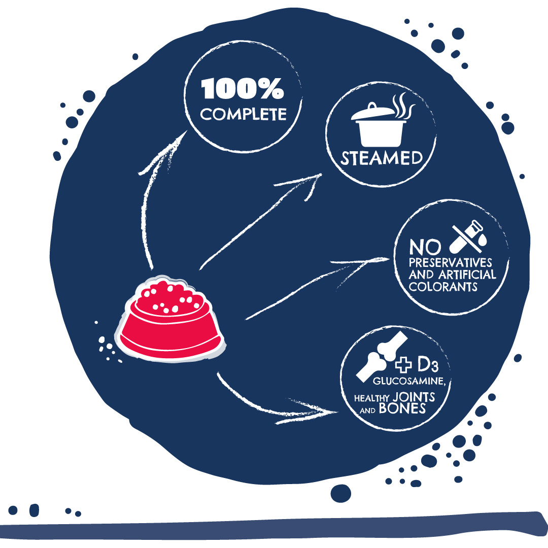 - Pełnoporcjowy posiłek dla dorosłych psów w postaci mięsnych kawałków w pysznym sosie
